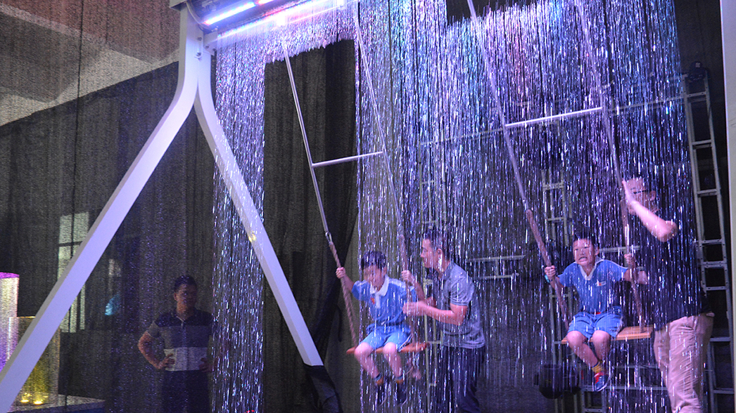 水簾秋千是在數(shù)字水簾功能上的運(yùn)用機(jī)械及控制原理。使秋千的擺動(dòng)信號(hào)自行傳送到秋千控制系統(tǒng)。秋千控制系統(tǒng)通過擺幅周期和速度來計(jì)算控制水簾的電磁閥。我們坐上秋千在各種水形中來回穿梭,不僅能近距離觀賞水形圖案,又能體驗(yàn)各種水形圖案中穿梭卻不被水淋到的刺激。 取下秋千,即可作為床柜的數(shù)字水簾做各種圖形、文字表演。讓水簾不只是觀賞的水景產(chǎn)品,更是娛樂互動(dòng)的水景觀產(chǎn)品。