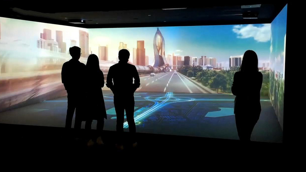 四折幕影院利用墻面連貫造型組成巨幅畫(huà)面,通常以左中右下四面墻作為顯示面。將觀眾水平視角包裹,畫(huà)面統(tǒng)一連貫,畫(huà)面通常容納內(nèi)容較多,適合全景展示或多內(nèi)容分屏展示。觀眾觀看影片時(shí),視角(余光)被完全包裹,仿佛置身于真實(shí)的三維場(chǎng)景中,體驗(yàn)感、展示效果極其震撼。
